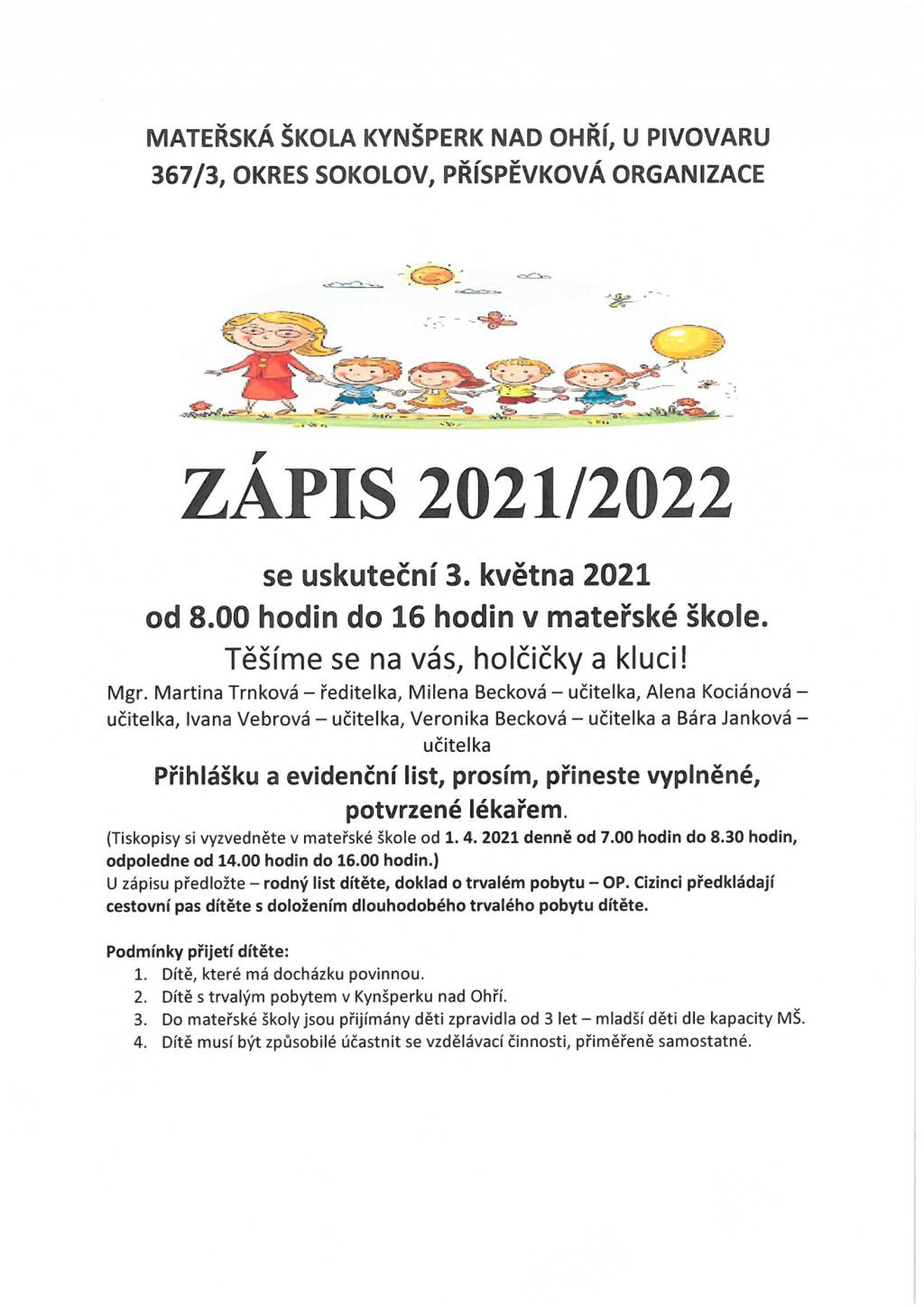 Zápis - MŠ U Pivovaru, Kynšperk nad Ohří